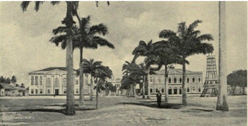 Em 1863, ali já estavam edificadas as primeiras construções oficiais, as quais podem ser observadas na Figura 6, em fotografia capturada na primeira década do século XX, o Palácio Olímpio Campos (à direita) e Palácio Fausto Cardoso (à esquerda), interligadas pelas palmeiras enfileiradas, o que transmitia uma imagem imponente a partir da organização do espaço e das arquiteturas em construções consolidadas com uma linguagem que faz releitura ao estilo neoclássico simplificado (Oliveira; Pina Neto, 2017). No centro, ao fundo da fotografia, também é possível observar o prédio da Igreja Matriz, na Praça Olímpio Campos. A Figura 7, sob a mesma visada, exibe as mesmas arquiteturas com mudanças estéticas que foram feitas na década de 1920.