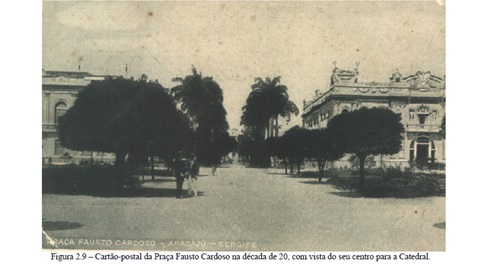 É possível visualizar nas figuras acima que, nos anos de 1930, na Praça Fausto Cardoso, prevalecem diversos elementos simbólicos da modernidade. Rodeada por calçamento, observa-se a presença de pessoas circulando ou usufruindo do espaço, um jardim organizado e bem cuidado. Incluía-se à sua decoração, em estilo neoclássico e eclético, o mobiliário urbano que a embelezava: coretos com estátuas de pequenas ninfas; fonte com espelho d'água; postes de iluminação e, em destaque, uma estátua em bronze de Fausto Cardoso de Aguiar, sobre um pedestal de mármore com acabamentos em bronze que ressaltam os dizeres em letras maiúsculas: “agosto 23 de 1906, a Fausto Cardoso, o povo – vou morrer defendendo a honra da minha terra”. Também compõem a imagem da praça outros elementos simbólicos do equipamento urbano, como o bonde elétrico, carros estacionados, arquiteturas imponentes e a paisagem como um todo, que tem ao fundo o Rio Sergipe interligado à praça pela Ponte do Imperador (Aracaju, 2009).