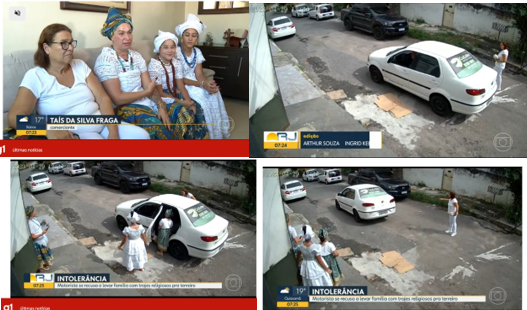 Uma mixagem entre imagens e textos lidos vão compondo o acontecimento e configurando um sentido que direciona a reflexão para um lugar específico. As pessoas envolvidas no ato de intolerância religiosa não são negras. No fotograma, o carro aparece, a primeira mulher, apenas de branco e sem roupas de santo, não assusta. Nada se marca sobre seu corpo, a significando em outro lugar distinto do lugar que, pelas formações imaginárias que funcionam nos processos de significação do motorista de aplicativo, não o desidentificam dela, mas das demais. A escolha para que a reportagem seja feita por um repórter negro significa na imagem, mesmo que a esse respeito nada se mencione.