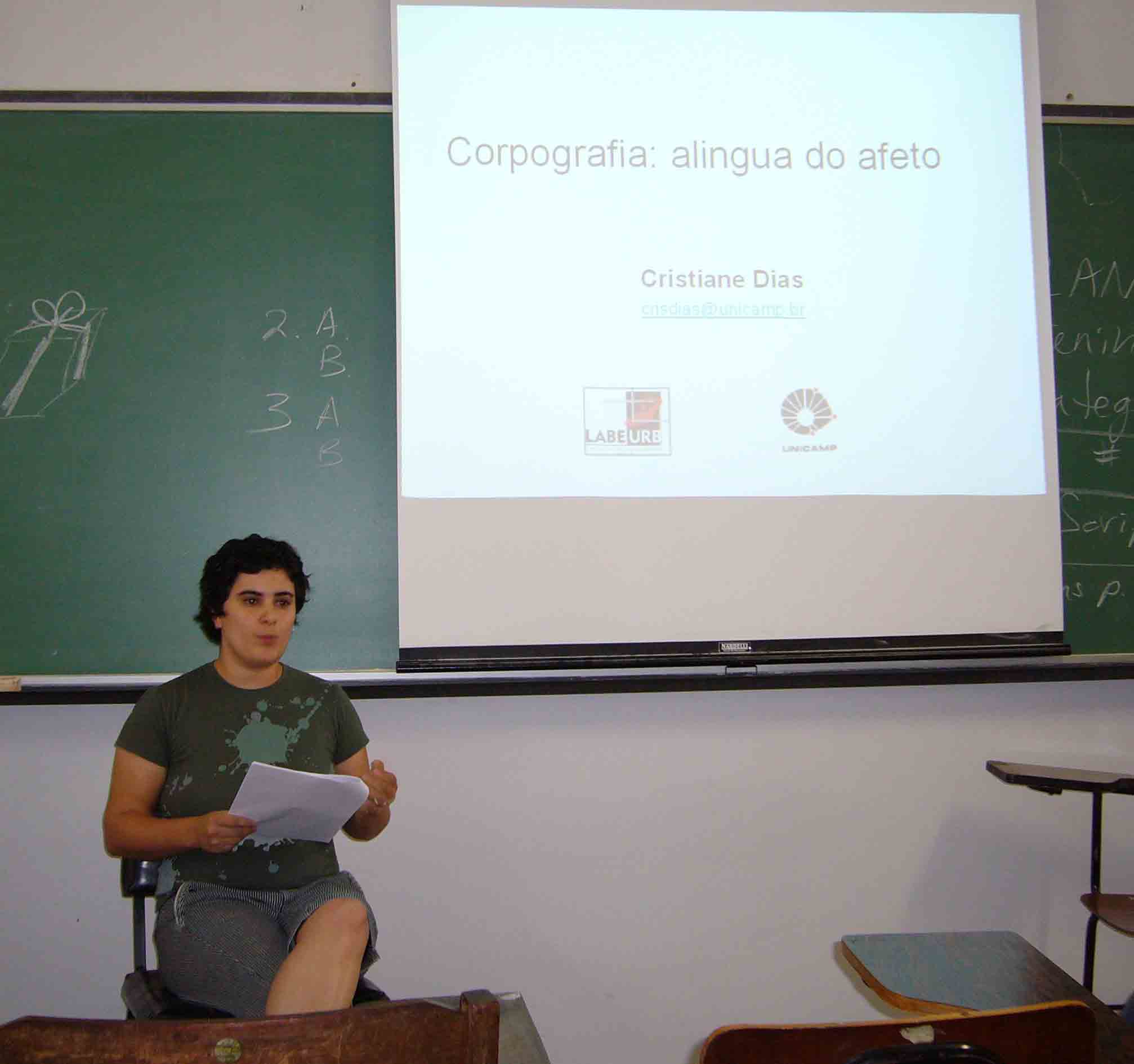 Cristiane Dias apresentou o conceito de ’corpografia’ sobre o qual vem trabalhando e que foi formulado a partir de suas reflexões sobre a escrita no espaço digital, mais especificamente, nas redes de relações da Internet, tais como salas de bate-papo, instant messenger, fóruns de discussão, livro de recados do Orkut.