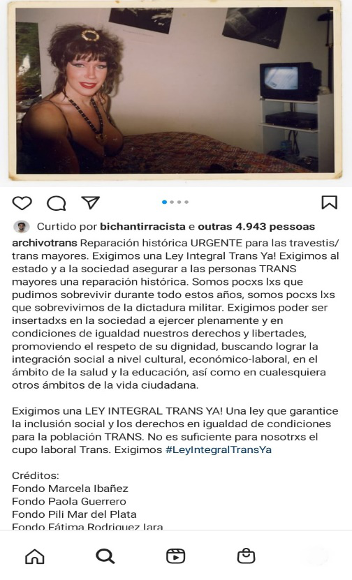A partir de prints da rede social Instagram, podemos acessar o “Archivo de la Memoria Trans”, @archivotrans3, página argentina, de uma organização não governamental, que se apresenta como ““Espacio fundado por María Belen Correa, para protección, construcción y reividicación de la Memoria Trans.” Espaço fundado pela ativista trans María Belen, conhecida na luta pelos direitos LGBTQIA+ na Argentina. Essa definição na “bio” do instagram indicam três grandes objetivos: proteção, construção, reivindicação da memória trans. Essa iniciativa, então, pretende proteger determinados arquivos para que uma memória das transgeneridade na Argentina seja construída. A própria publicação na rede social pode se constituir como um arquivo, que se compõe pela falta, pelo excesso, pelo desejo de completude.