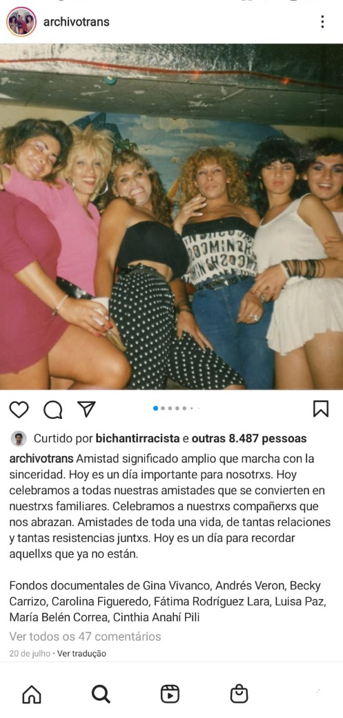 Na imagem 3, seis mulheres trans juntas, felizes, abraçadas, fotos de fundos documentais, publicadas no Dia da Amizade, 20 de julho, com dizeres como “Celebramos as nuestrxs compañerxs que nos abrazan. Amistades de toda uma vida, de tantas relaciones y tantas resistências juntxs. Hoy es um dái para recordar aquellxs que yá no están.”. Recordar aqueles que não estão, aqueles que estavam à frente nos momentos de luta, na resistência, é algo que tanto os Archivos de la memoria trans como o Acervo Bajubá se interessa uma vez que