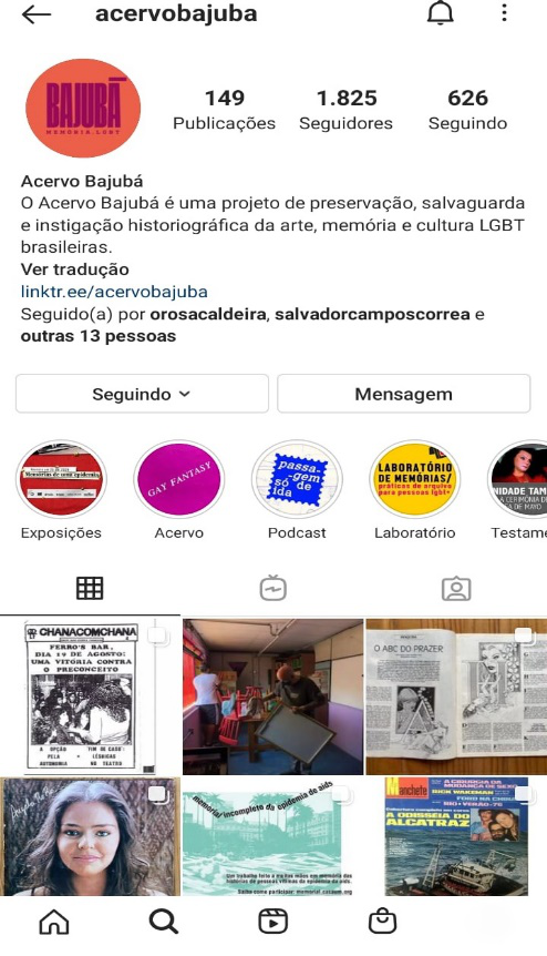Na bio da imagem 4, podemos compreender que “O acervo Bajubá é um projeto de preservação, salvaguarda e instigação historiográfica da arte, memória e cultura LGBT brasileiras.” As palavras preservação”, “salvaguarda” e “instigação historiográfica” qualificam esse projeto em torno da arte, memória e cultura LGBTQIA+ brasileira. O que se diferencia do @archivotrans é que a página brasileira abrange um grupo mais amplo, como dissemos. Diferença que não implica no maior número de seguidores na página brasileira, pelo contrário, é bem inferior a página argentina. Também observamos outros pontos nessa imagem, os destaques como “exposições”, “acervo”, “podcast”, entre outros. E algumas publicações que compõe o acervo, jornais históricos da população LGBTI+, como o ChanaComChana, jornal pra lésbicas, eventos, personalidades LGTI+ como a cantora Angela Ro Ro, etc. Sobre o comparecimento desses sujeitos em matérias jornalísticas, traremos uma outra imagem.