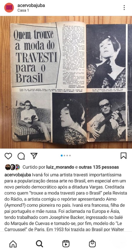 Na imagem 5, há uma publicação de uma matéria da Revista do Rádio com Ivaná cantando, creditada como diz na manchete “Quem trouxe a moda do travesti para o Brasil”. Inscrito neste enunciado há alguns dizeres que ressoam sobre a memória desses sujeitos: 1. Moda travesti. Algo que alguém inventa e “traz”, algo que não é das identificações do sujeito. 2. O travesti. Neste momento, e ainda utilizado como uma forma de deslegitimar as identificações trans, são usados pronomes no masculino. Na legenda da imagem, há algo que faz eco ainda hoje a relação identidade e performance: “Após inúmeras performances ao longo das décadas de 1950 e 1960, participação em cinco produções cinematográficas, Ivaná foi uma superestrela na arte travesti no Brasil.”.