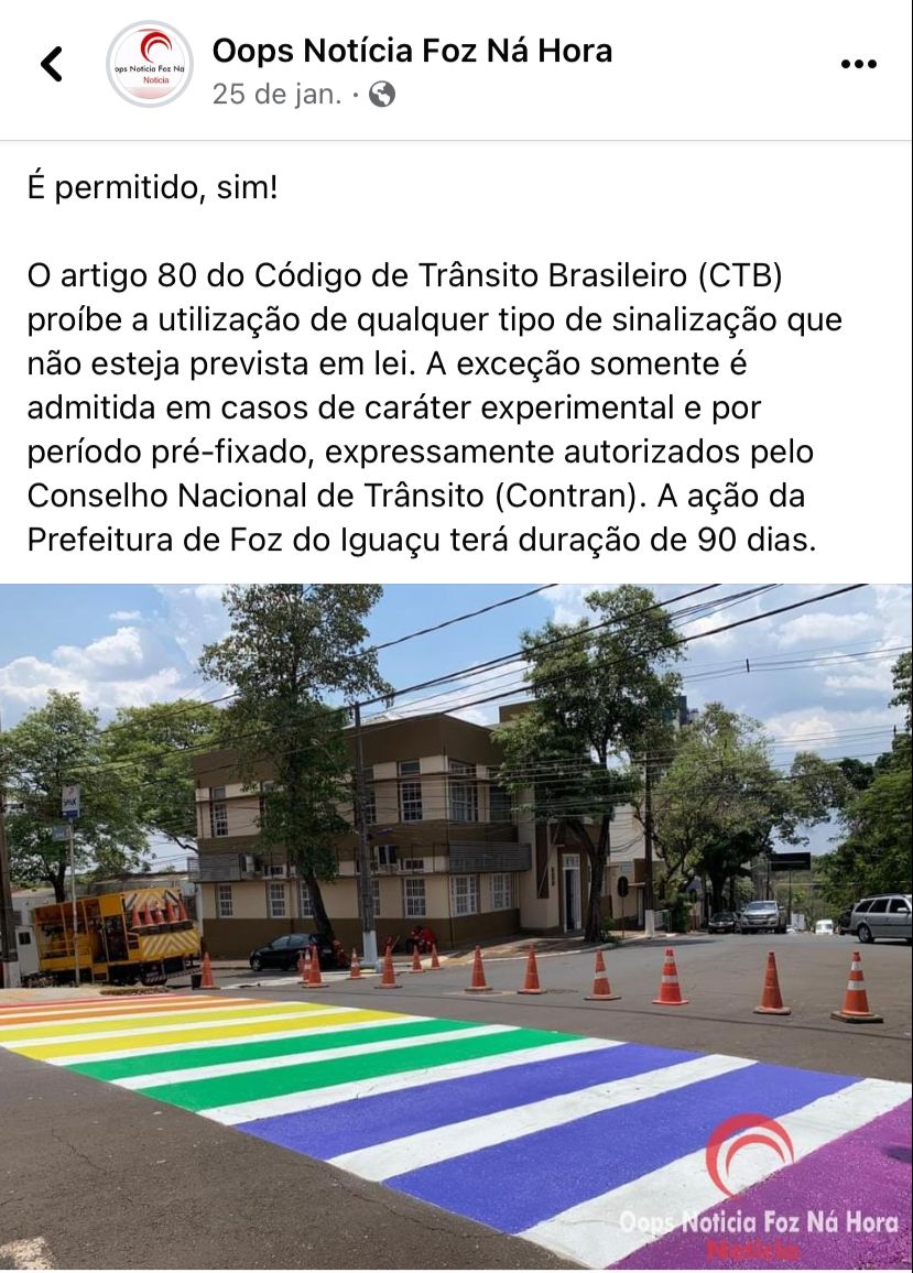 Em um primeiro momento, temos a publicação acerca da pintura da faixa de pedestres realizada no dia 25 de janeiro pela página de notícias e divulgação de informações, com uma legenda que trata de sua legalidade conforme o artigo 80 do Código de Trânsito Brasileiro (CTB) e da duração da ação promovida pela Prefeitura da cidade de Foz do Iguaçu (90 dias), como podemos observar na figura a seguir: