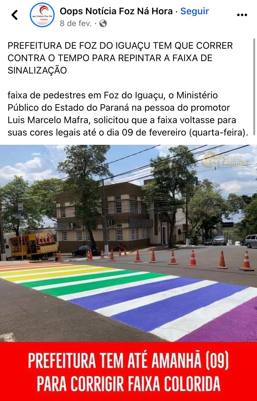 No dia 08 de fevereiro, a mesma página do Facebook publicou a informação de que a prefeitura da cidade de Foz do Iguaçu teria que “correr contra o tempo para repintar a faixa de sinalização” e reestabelecer suas cores “legais”, até o dia 09 de fevereiro. Novamente, perfis visitantes da página comentaram acerca da repintura da faixa de pedestres: