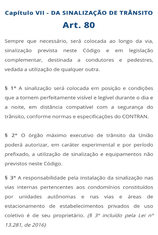 BRASIL. Artigo 80, capítulo VII – da sinalização de trânsito. Código Brasileiro de Trânsito (CTB) Digital. Disponível em: <https://www.ctbdigital.com.br/artigo/art80#:~:text=Sempre%20que%20necessário%2C%20será%20colocada,a%20utilização%20de%20qualquer%20outra>. Acesso em: 21 jun. de 2023.