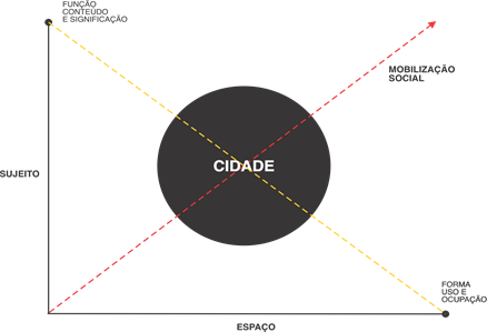 A cidade opera no eixo formado por sujeito e espaço (figura 2). No polo do espaço estão as formas ideologizadas e responsivas a sistemas de poder, bem como os exercícios de uso e ocupação. A função dos/nos espaços e sua extensão de conteúdo e significados estão no polo dos sujeitos, dispostos à ação. Produz-se, no vértice entre os pontos, a vida na cidade.