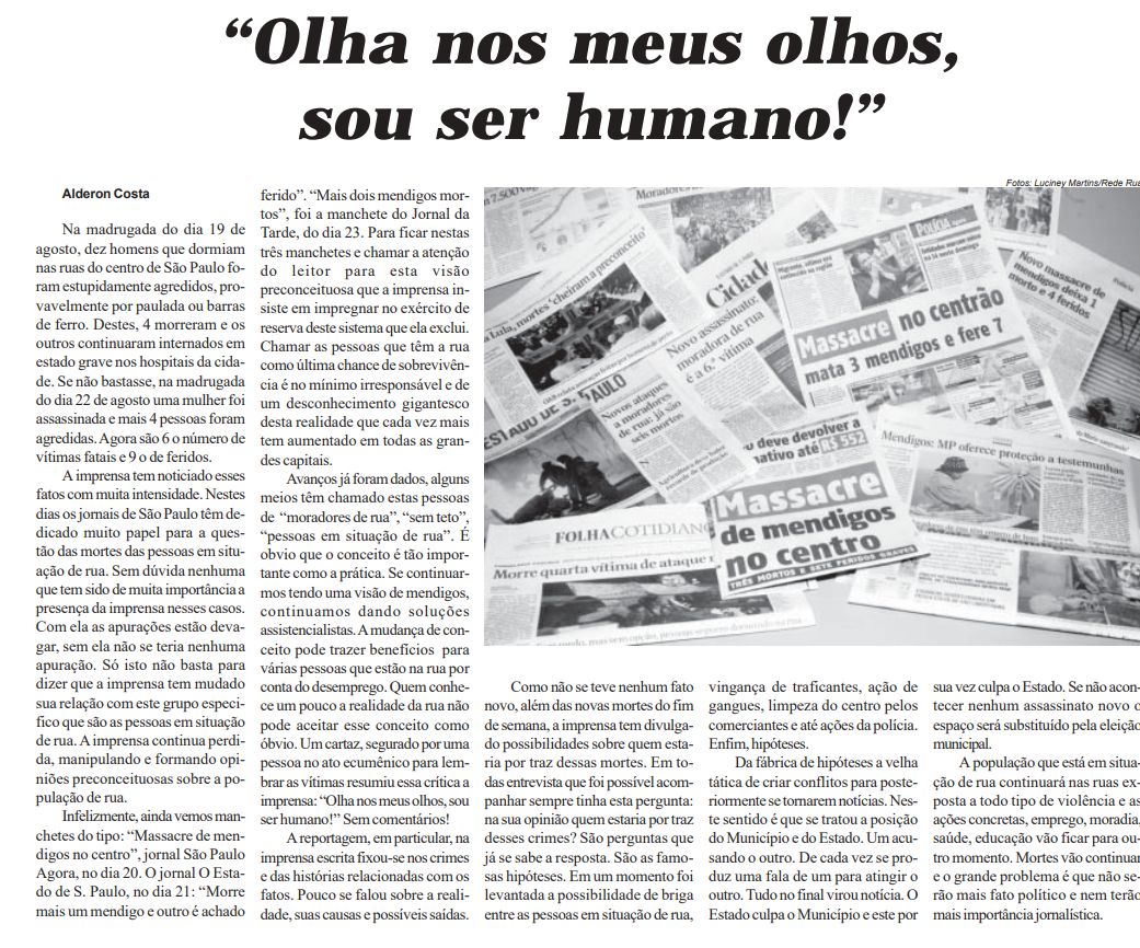 Ressaltamos, assim, que a nomeação como “massacre do povo da rua/ das pessoas em situação de rua/ dos moradores de rua”, produz identificações e que nomear o acontecimento é um gesto sobretudo político. Um traço marcante das reportagens do jornal O Trecheiro é que muitas denunciam a nomeação “Massacre de mendigos no centro” pela mídia hegemônica como preconceituosa: “povo da rua não é mendigo não!” é a resposta textualizada – uma negação forte, polêmica, que mostra uma relação antagônica e que aponta para uma disputa por nomeação e por dizer o acontecimento de outro jeito, a partir de outras vozes, com outros focos e enquadramentos34. Por mais que saibamos que as palavras não possuem sentido fixo, o jornal parece apontar para uma memória de desumanização (que borra as fronteiras entre sujeito e abjeto35, vida e não vida, e as possibilidades de comoção) acionada pela palavra “mendigo” – como da resposta dos assassinos “justificando” a morte de Galdino em 1997: “pensamos que era um mendigo”36.