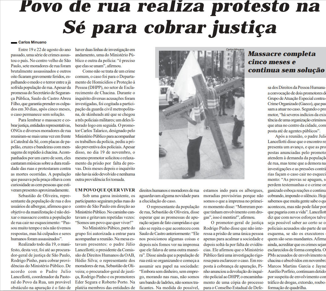 No jornal O Trecheiro, o acontecimento é nomeado também como “Massacre do Povo da Rua”, “Chacina dos Moradores de Rua” e “Massacre das Pessoas em Situação de Rua”33, trazendo para além da dimensão do espaço, a dimensão do sujeito massacrado, ao mesmo tempo que continua não explicitando o Estado (a polícia) como responsável pelo massacre – esse apagamento revela traços da impunidade, tendo em vista que não se responsabilizou ninguém, até hoje. Estas nomeações, ao colocar em jogo o sujeito massacrado, povo da rua/moradores de rua/pessoa em situação de rua, acionam uma memória que inscreve este acontecimento singular do dia 19 numa cadeia macabra de repetições: