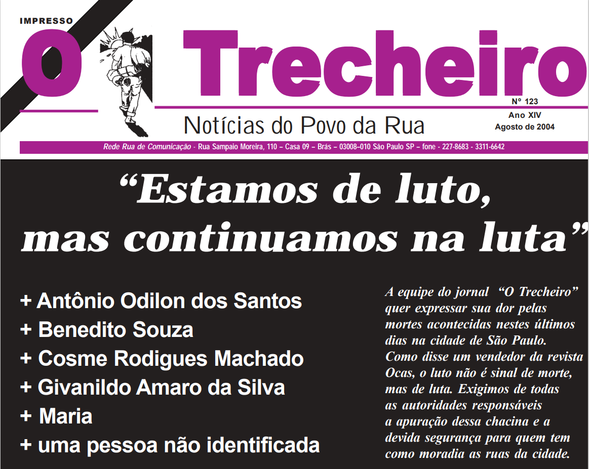 O massacre da Sé, em agosto de 2004, foi um marco na história de lutas da população de rua. O Trecheiro entrou em luto e passou a trazer uma tarja preta desde então. Mas diante da impunidade, os movimentos e entidades não se calaram. [...] Hoje, os sentimentos são de esperança de empreendermos um caminho rumo à superação da desigualdade com mais justiça social. Diante deste novo momento, retiramos a tarja de luto do jornal porque a unidade e momento histórico nos impulsionaram para isso.