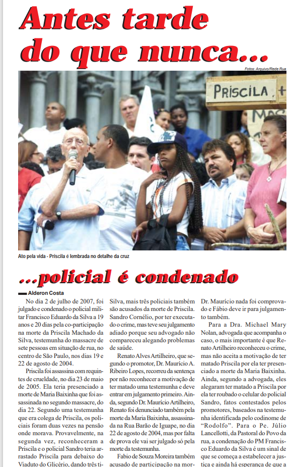 E os oito sobreviventes do massacre? E a Priscila Machado da Silva, única testemunha do massacre que chegou aos tribunais, e que foi assassinada por um policial no dia 23 de maio de 200548? Isso acrescenta outra dimensão acerca das impossibilidades de dizer do testemunho, para além da que já pontuamos: a testemunha coloca sua vida em risco. O que foi de fato o caso. No jornal O Trecheiro, em julho de 2005, escreve-se a manchete “Povo da rua pede coragem às testemunhas do massacre”49 e afirma-se que “muita gente sabe o que aconteceu, mas não pode falar porque pagaria com a própria vida” 50. Aciona-se a memória de que vivemos num país em que o Estado tortura, mata e silencia/censura51 as vozes que “falam quando se exige silêncio” (Pêcheux, 1990). Dando uma dimensão da resistência que foi necessária para que estas mortes não permanecessem em silêncio e que o luto ocupasse o espaço público e fosse declarado/ reconhecido.