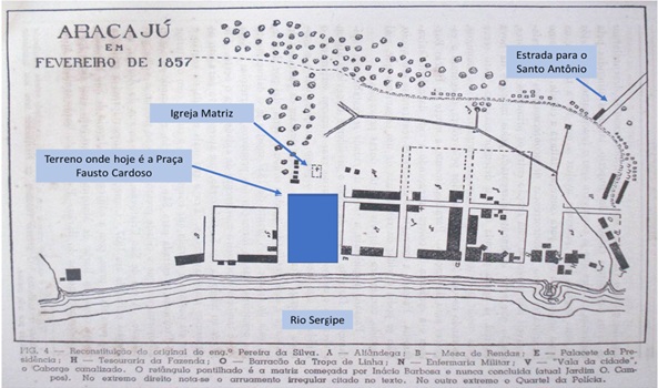 Seguindo as indicações feitas no quadrado de Pirro, na Figura 3 é possível visualizar parte da planta de Aracaju, redesenhada durante a execução das obras na zona central da cidade, em 1857, pelo engenheiro Pereira da Silva (Santos, 2024). Observa-se já identificada na legenda disposta abaixo da referida figura, a localização espacial de prédios que seriam edificados no entorno da praça central: Alfândega; Mesa de Rendas; Palacete da Presidência; Tesouraria da Fazenda, Barracão da Tropa de Linha; Enfermaria Militar, Quartel da Polícia, além de obras de infraestrutura como vala da cidade. As inserções feitas ao desenho original da Figura 3 (na cor azul), destacam no centro da cidade a atual posição do Rio Sergipe em relação à localização do prédio da Igreja Matriz (hoje Praça Olímpio Campos), a estrada para Santo Antônio e, no espaço central, a atual Praça Fausto Cardoso.