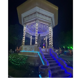 Ao se observar um dos coretos iluminados na praça (Fig. 19), supõe-se que esse elemento afeta o emocional e reforça a imagem ilusória de uma cidade ideal, esquecendo das mazelas diárias. Isso pode levantar questões acerca da dicotomia entre a fantasia eventual e a realidade cotidiana. Argan (1998) argumenta que tais eventos criam uma imagem idealizada da cidade, como segura e limpa, em contraste com a realidade urbana. O ideal é que os espaços públicos sejam convidativos para a vida cotidiana dos cidadãos, não apenas em ocasiões esporádicas.