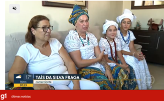 Repórter Rogério Coutinho: O motivo da dor tem a ver com preconceito e intolerância. Elas foram surpreendidas pela reação de um motorista de aplicativo que se prontificou a atender a um chamado. Nas imagens o carro chega e é recebido pela dona Vera, que está vestida apenas de branco. Ela é a primeira pessoa a ter contato com o motorista. Em seguida vem as netas de 8 e 13 nos e a nora, a Taís, todas também de branco, mas vestidas com roupa de santo e com ojá, esse pano que vai na cabeça. Segundo a família, quando o motorista as vê desiste da corrida.