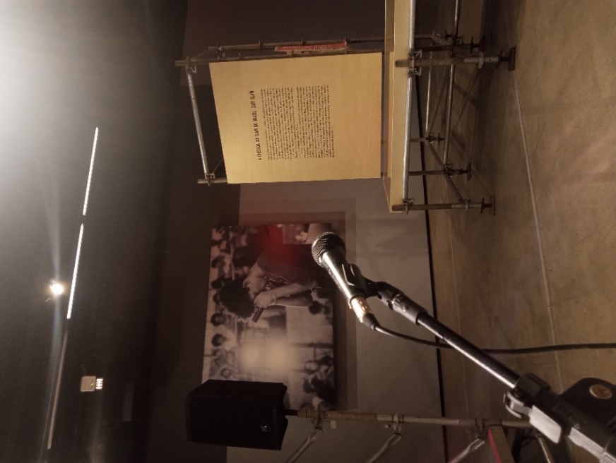 Mesclando fotografias, palavra escrita e falada, acervos importantes como camisetas de coletivos, tabelas de edições de batalhas, livros, troféus, entre outros itens, organizados de forma circular, nos fazem acompanhar a trajetória dos 15 anos de slam no Brasil em 360º. Propondo uma experiência de máxima irmersão, ao centro do grande círculo narrativo estava montada uma arena na qual havia um microfone aberto para qualquer visitante que fosse atraído (Figura 2). Além de conhecer a história do slam brasileiro, poderíamos experienciar uma performance no microfone aberto. Ser slammer por um dia. É o acesso democrático da poesia proporcionado pela literarura periférica.