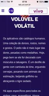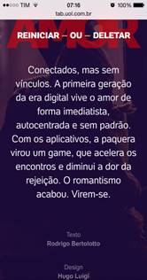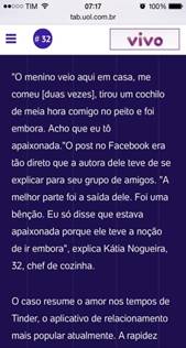 Assim, antes de ir diretamente ao aplicativo (porque o que vou apresentar aqui são movimentos iniciais de análise) tomo como lugar de entrada e de visibilidade do discurso, a circulação do dizer sobre os encontros mediados pela tecnologia. Para isso apresento três recortes de um TAB veiculado pelo UOL.