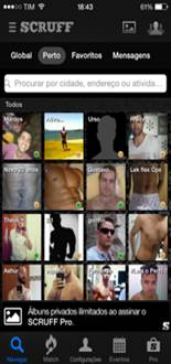 Uma vez na App Store, da Apple ou da Samsung, é deste modo que o possível usuário do aplicativo Scruff será recebido ao pesquisar a palavra e produto. Esse aplicativo de celular, desenvolvido no coração de São Francisco, nos Estados Unidos, foi dirigido primariamente ao encontro de ursos, ou seja, a denominação dada ao homem com barba ou cavanhaque, de peito peludo e corpulento (adulto ou mais velho), na cultura gay[2]. Todavia, esse aplicativo tomou outras proporções: ele produziu hoje uma rede de serviço geosocial gay que reúne mais de cinco milhões de indivíduos, em 180 países. O Scruff, enquanto uma ferramenta de aplicação, cujo acesso virtual articula corpo e localização, tem sido a chave de expansão na contemporaneidade para a sociabilidade gay entre homens. Essa expansão tem produzido no espaço acadêmico questões importantes, tal qual a articuladada por Roth (2013, p. 2114): “está o software móvel do scruff envolvido no processo de construção de uma nova configuração social e espacial da vida gay?”
