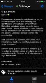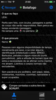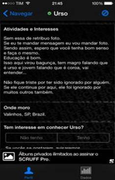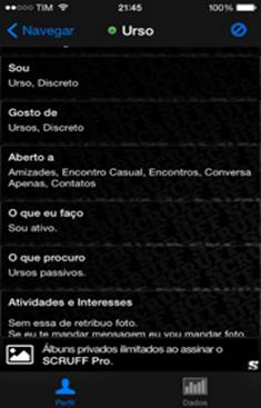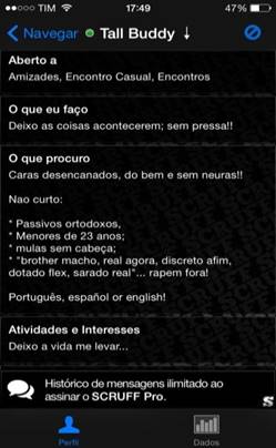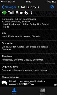 Na leitura deste aplicativo interessa-me pensar a entrada do sujeito na ordem de um discurso que pressupõe a sua enunciação. Quero refletir o jogo entre corpo e enunciação, particularmente a enunciação que não faz série e, para isto, vou me deter nos perfis de usuários que compõem a rede dos scruff guys, o corpo scruff.