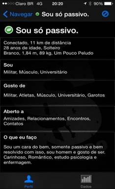Há, ainda, a categoria sou. Ela é aqui muito importante, porque as palavras selecionadas para dizer de si mesmo são opções lexicais apresentadas pelo aplicativo. De fato, o aplicativo enquanto cena de enunciação determina o sentido do “sou” do usuário. E essa determinação é construída através de etiquetas discursivas que procuram comunicar algo do universo gay contemporâneo: militar, nerd, passivo, ativo, urso, casado e, o mais intrigante, discreto. A palavra “discreto” é, nas navegações que fiz pelo aplicativo, a que mais se repete. Eu me pergunto assim o que discreto, enquanto acontecimento de corpo em repetição, pode e quer dizer? Há, também, um elemento curioso: todo um jogo de ironia e, às vezes, de violência lexical que se materializa em palavras que classificam o gay: afeminado, lisinhos, do meio gls. Trata-se daqui e um aplicativo para gay em que, às vezes, não se tolera o encontro com o “gay”. Há algo da enunciação que não faz série, que recusa uma memória.