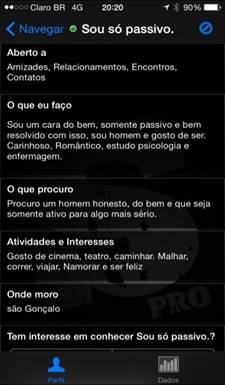 Destes seis recortes aqui apresentados optei, enquanto recurso metodológico e elemento preliminar de análise, em não apresentar a fotografia dos perfis usuários. Os perfis “Botafogo” e “Urso” não apresentam uma imagem de si (face) ou de seu corpo no aplicativo. Os outros três recortes os usuários apresentam a fotografia de face, o que coloca em evidência uma demanda dos usuários do aplicativo, a imagem de si, a aparência. Há ainda a questão da nomeação (um modo particular do léxico em que o usuário se denomina: chamo atenção, por exemplo, para o recorte “Sou só passivo” – que faz do nome uma declaração antes de qualquer pergunta; e ainda “Botafogo”, em que o nome do bairro é o elemento de identificação do usuário).